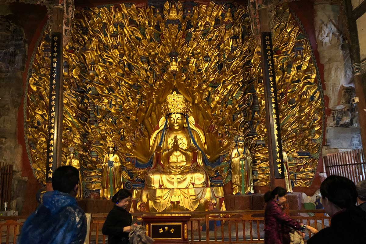 这里的千手观音像是很多人必打卡的地方。这尊千手观音雕凿于南宋中后期,有830只手,每只手有一只眼睛,每只手里持有不同的法器,如孔雀开屏,金碧辉煌,已经有800多年历史了,被誉为“天下奇观”,在八十八平方米的石崖上,雕出这830只手,可见当时的雕刻多么精细,在看观音身上有彩绘、贴金、雕塑,雕刻手法之高,在当时是无人能及。