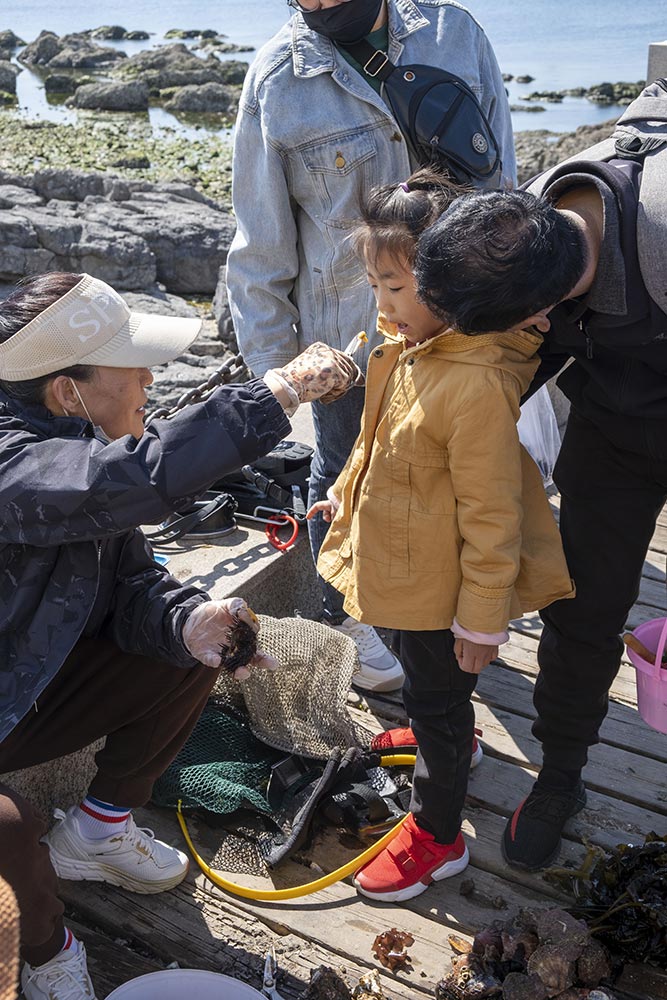 是我少见多怪了,不由的在想,明目张胆的在大连自然博物馆门前,黑石礁这片海域捕捞,没有人管吗?因为这一块是黑石礁公园景区范围内,大家都可以在退潮后自由的玩耍,一大片的黑褐色礁石上生长了许多的小海蛎子,一旦退潮,在坑坑洼洼的礁石之间还有许多的鲜美海菜,这些海菜是大连人最爱的,回家冲洗干净包包子吃。