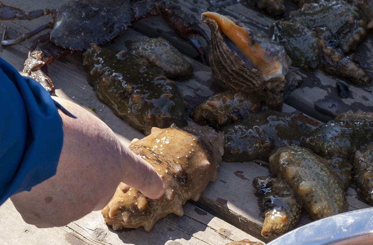 新鲜海螺60元一斤,海参150元一斤,其他蟹子有人问价格,答曰:不卖。这说明几只蟹子是犒劳自己的,回家自己吃了去。