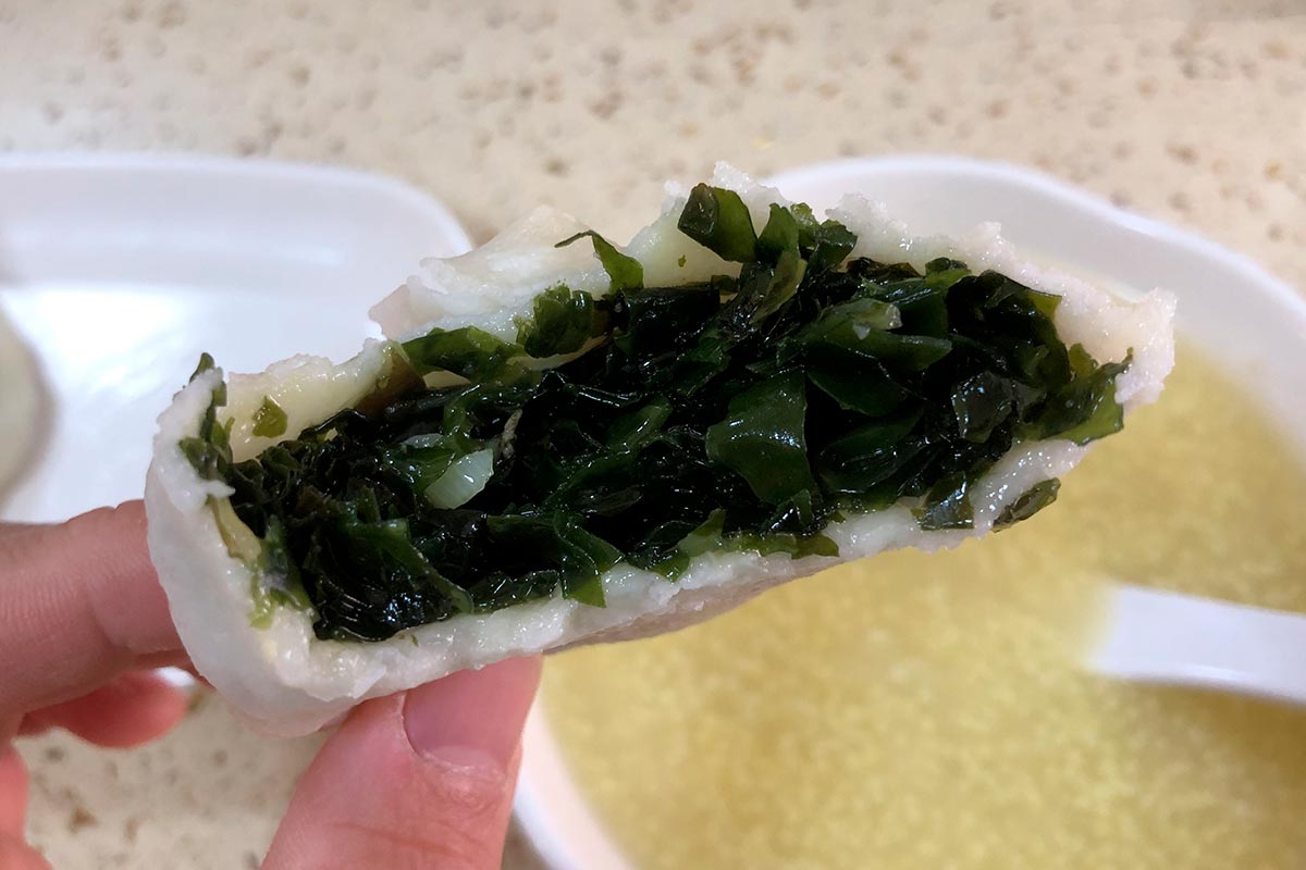 (海藻包子是大连的特色之一,大连快餐连锁三禾包子店每天早晨都有海菜包子,推荐去吃。如果加点海米就好了~)