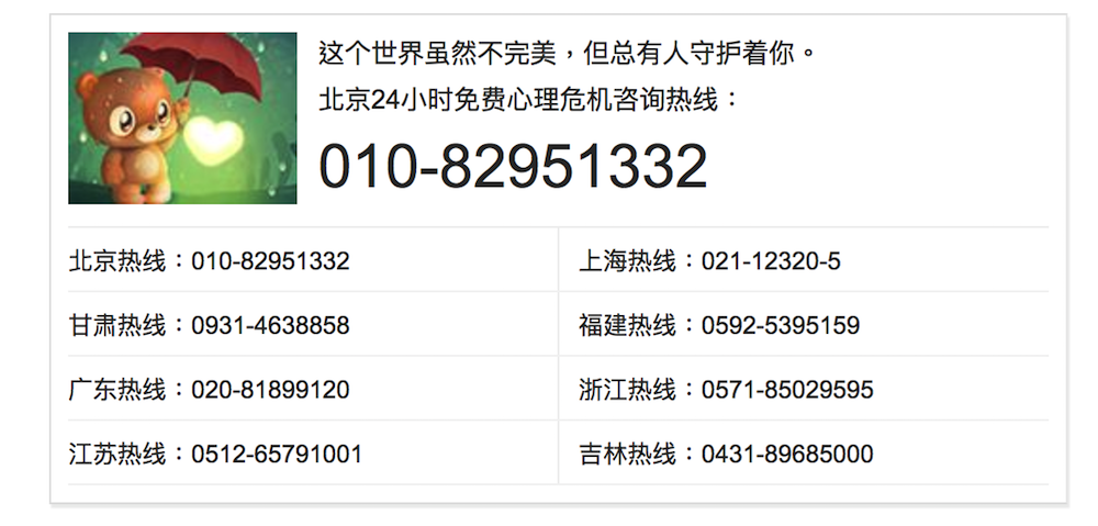 中国自杀干预心理热线,心里有什么不爽的都可以拨打这个号码: