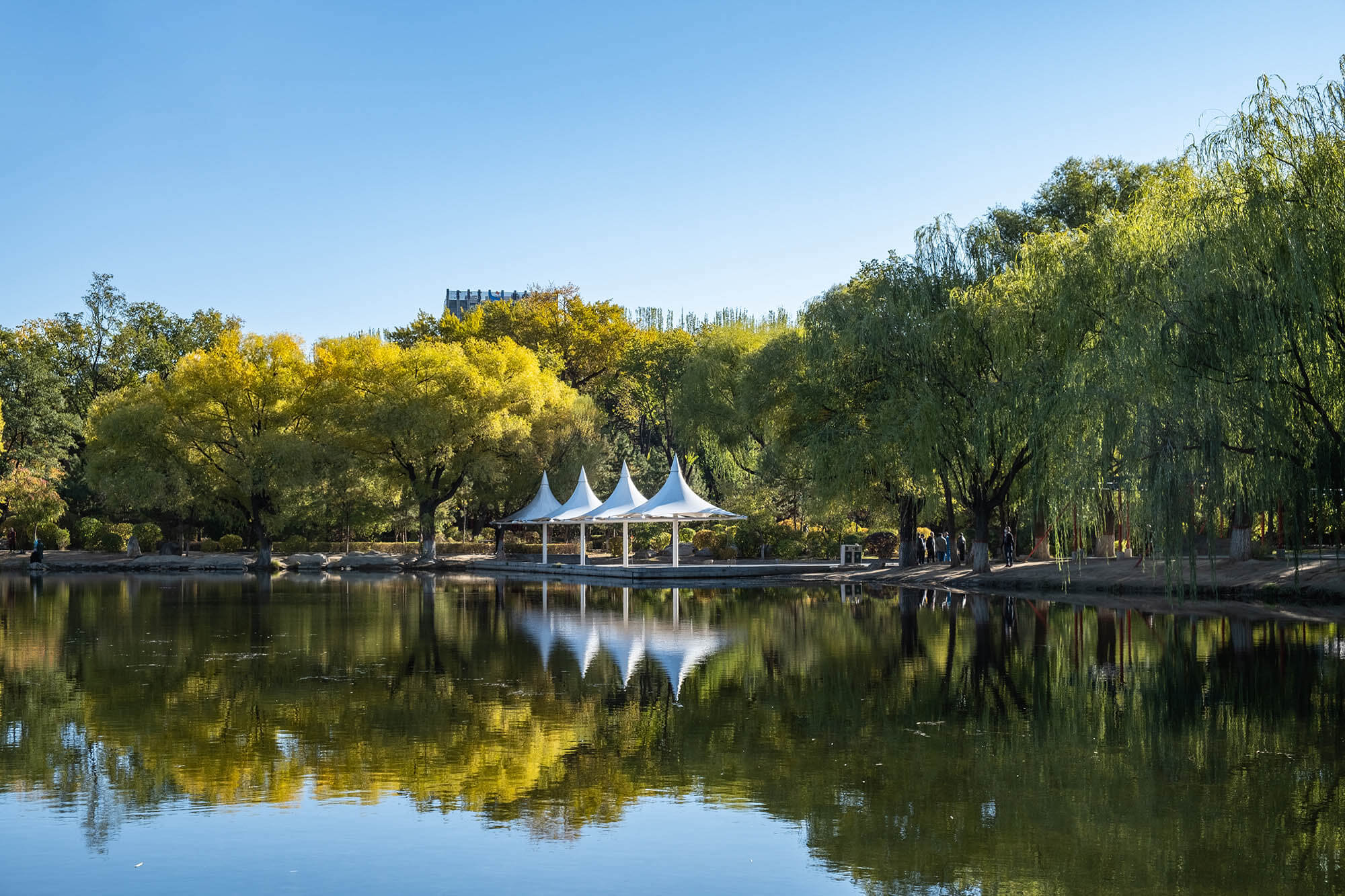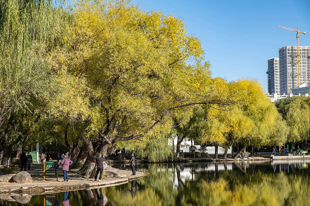 青城公园的美在秋天表现的淋漓尽致,公园内种植了大量的柳树和白桦树,柳树全部都是 50 年代时期建设呼和浩特市时种植的,白桦树高耸入云,笔直参天,即便是10月份,叶子还没黄,与发黄的柳树形成鲜明的对比,青城公园秋天的美震撼到我了。