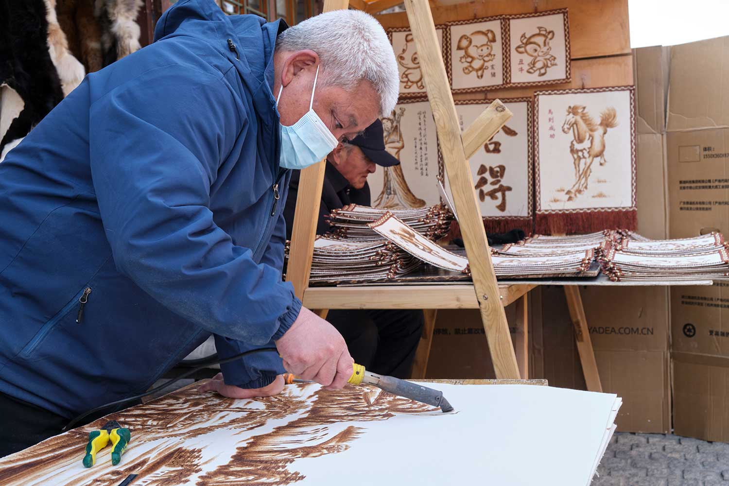 很多手工品我都是第一次见,比如:毡画。顾名思义就是在羊毛毡上画画,画画的画笔则是一把烙铁,远远的就能闻到烧羊毛的味道,炽热的烙铁在羊毛毡上冒着白烟,留下的是焦黄的痕迹,手工人就是用这些焦黄来作画。