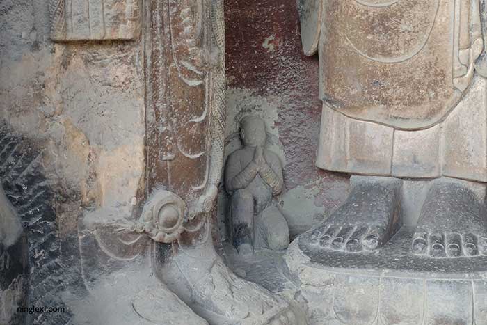 其实皇泽寺不只有武则天真容,它还是一个小型的石刻群,其中最大的石刻有一段小故事,就是下面这个跪拜在佛脚下的小人。