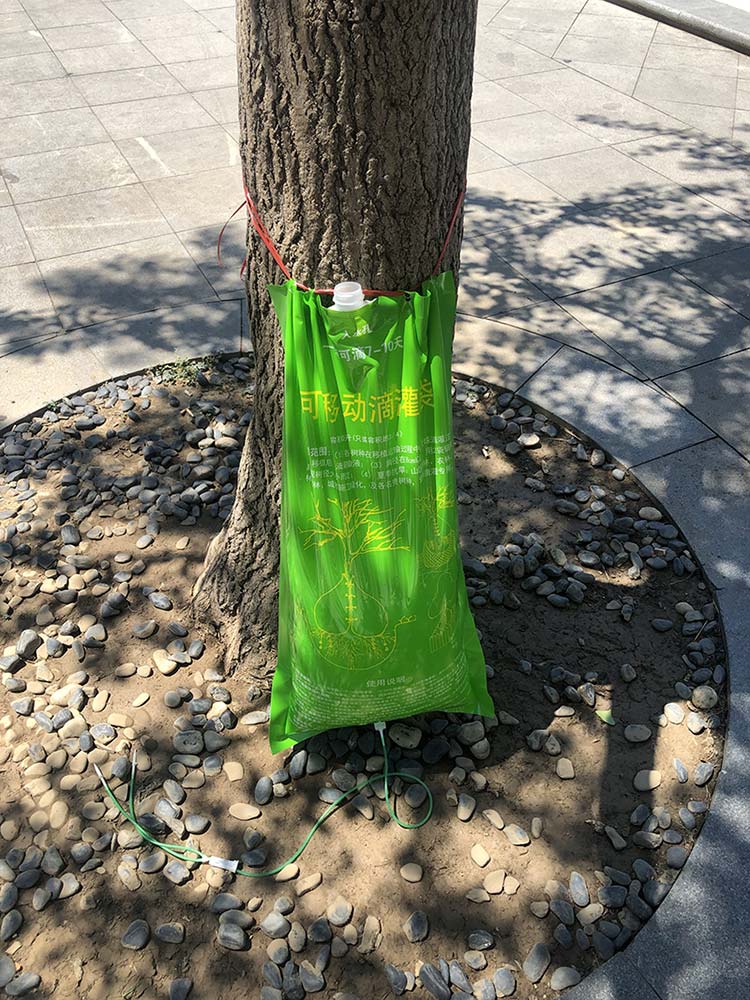 在武汉旅居的时候,经常会看到绿化带里的大树根有灌溉袋,好一点的用比较「专业」的灌溉袋,一根输液管插泥土里,相当于给大树底部湿润,用的跟人类打吊瓶的管子一样。