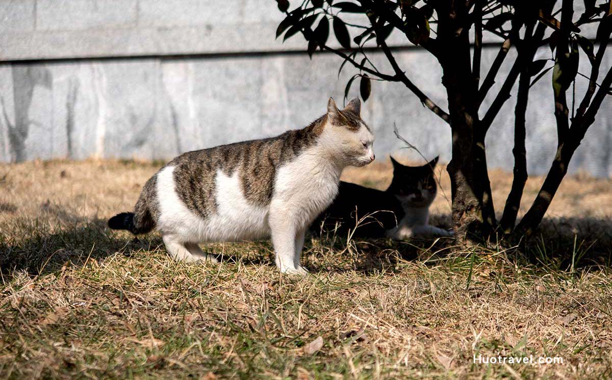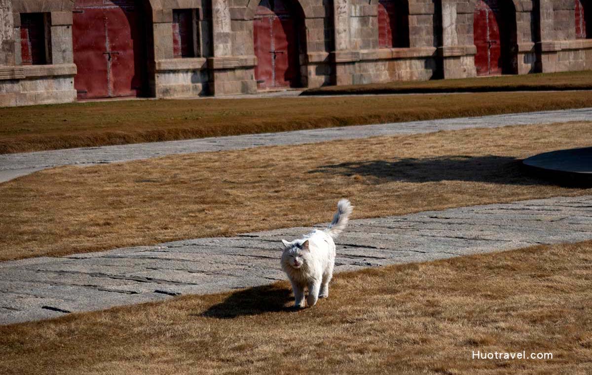在刘公岛上有很多只可爱的小猫,特别是刚下船后,在部队驻扎的区域有一块大草坪,有很多很多只猫,都是岛上的原著居民哦,每当到了饭点,它们都会凑过来要吃的。