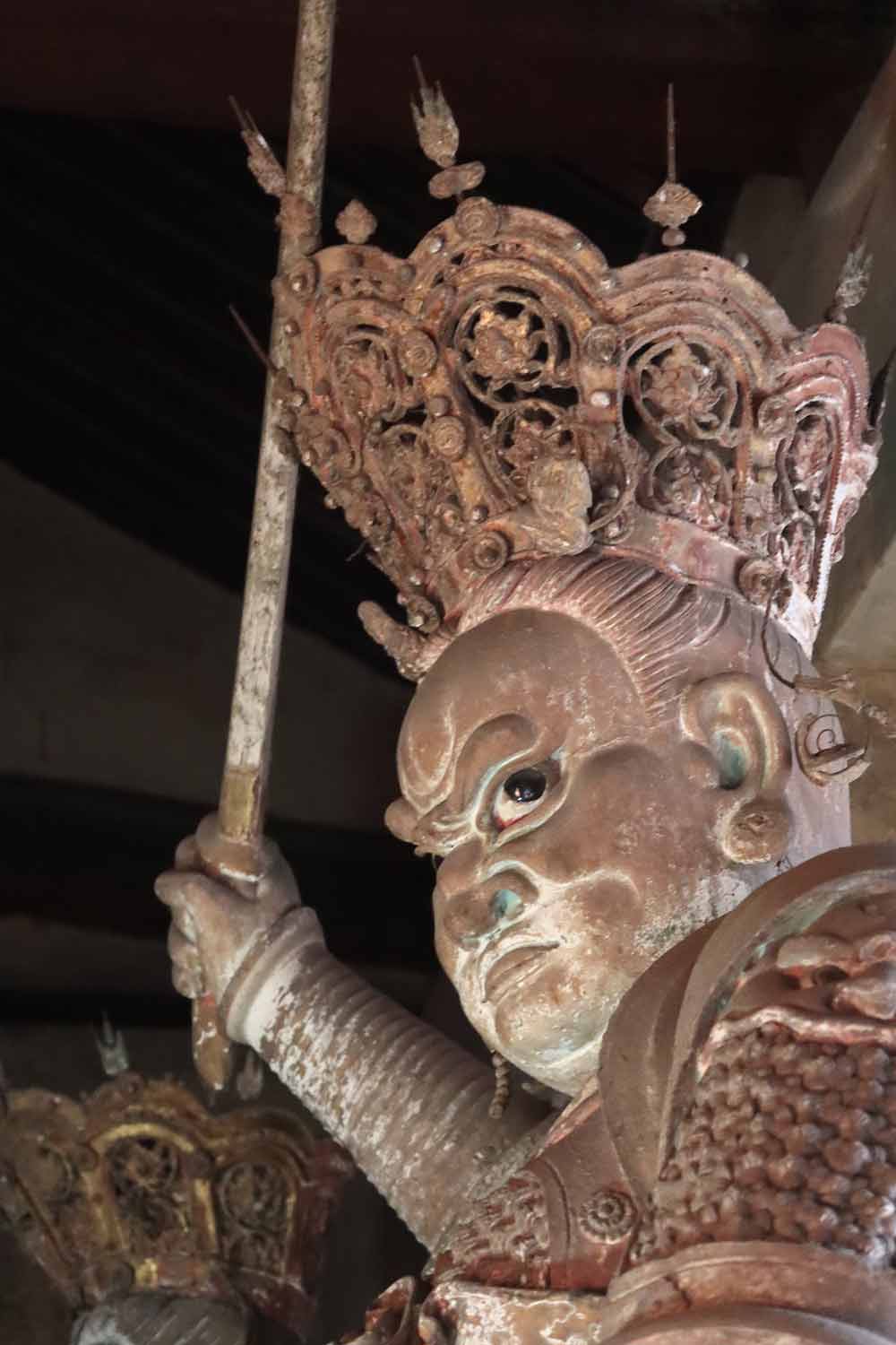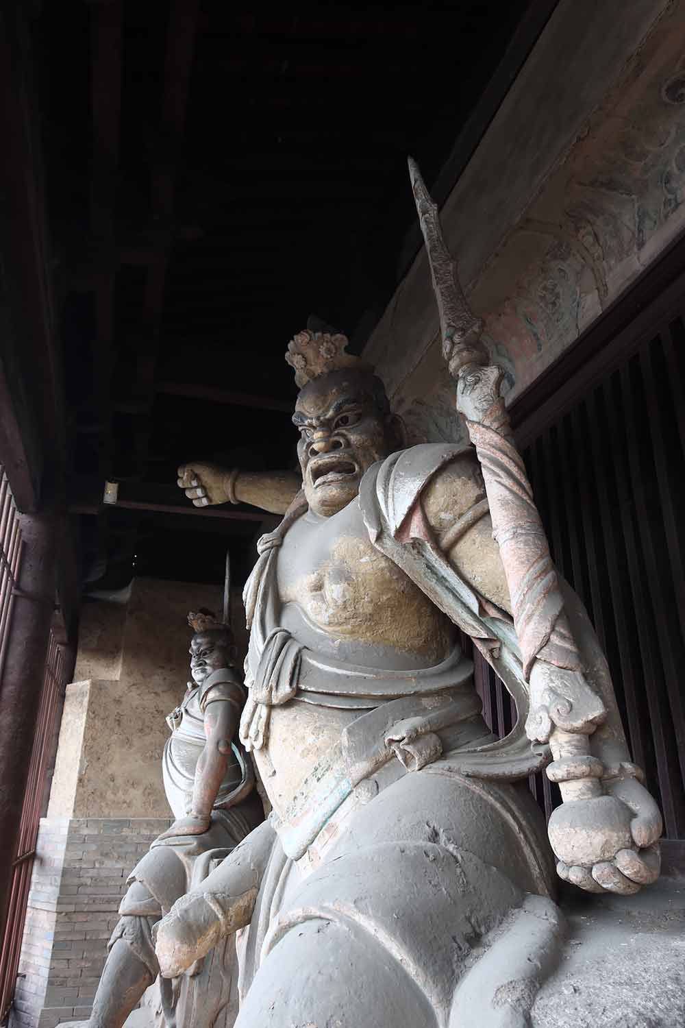 天王殿门口的四尊天王是双林寺最杰出的著作。土木结构彩塑,形象饱满,呼之欲出的样子非常符合佛教中天王的形象。大殿内并没有供奉弥勒佛,而是以精美的佛像彩塑代替,正中间的是释迦牟尼佛,旁侧也有四大天王的彩塑像,宝相庄严。
