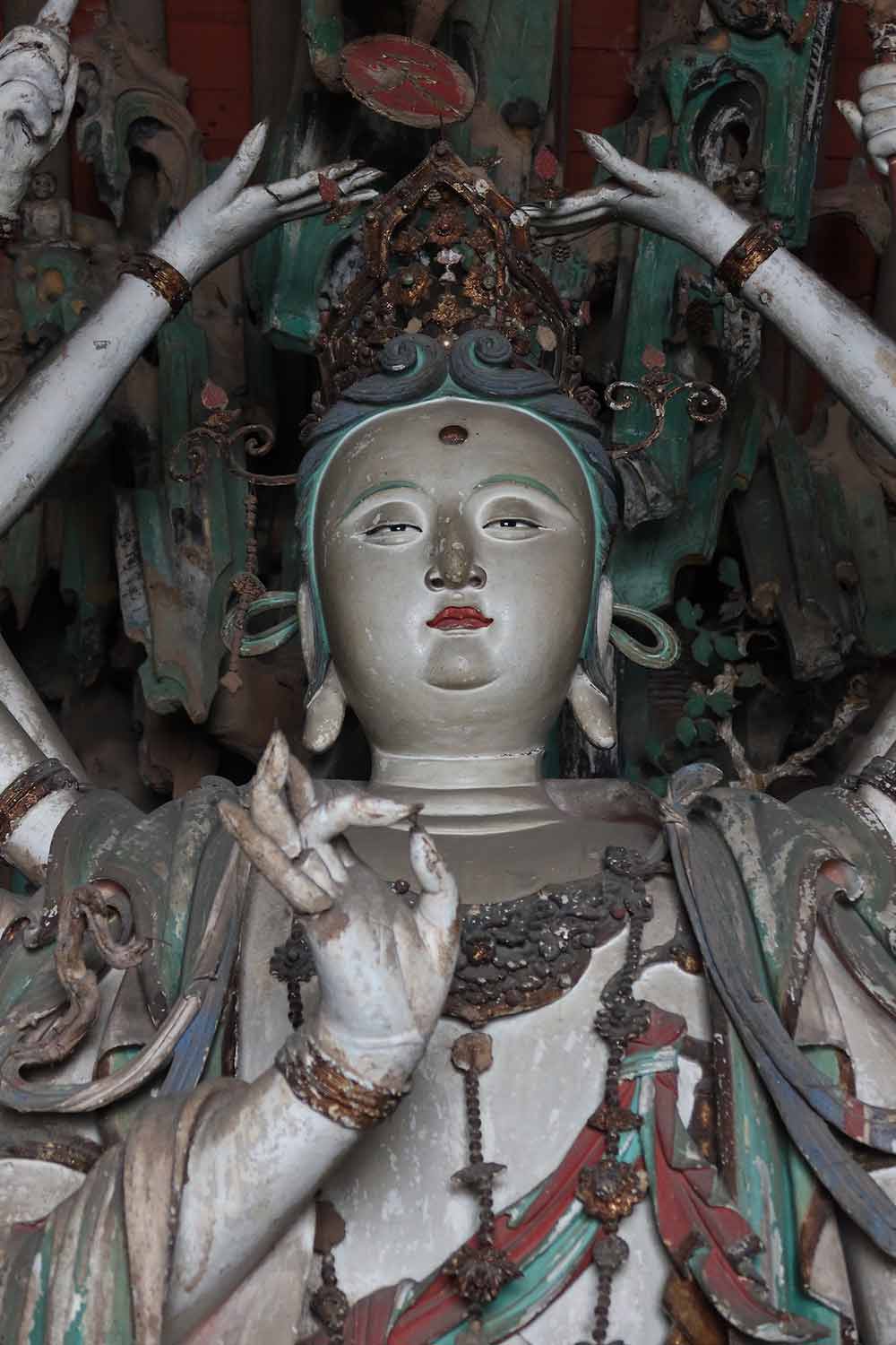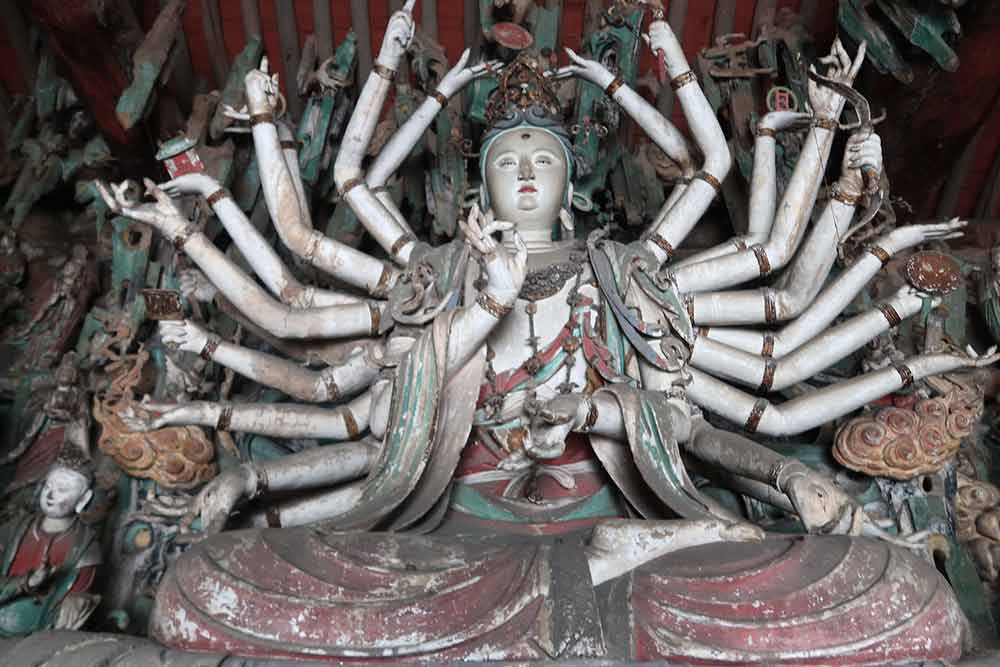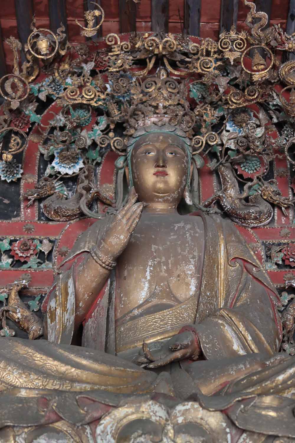 进入第二进殿,是千佛殿,有释伽牟尼佛和众多佛,规模宏大,保存完整,踏入大殿内,犹如来到一座石窟,上下左右都有彩塑佛像,各不相同,眼花缭乱,精美绝路,不得赞叹古代人对艺术之美的造诣很高。