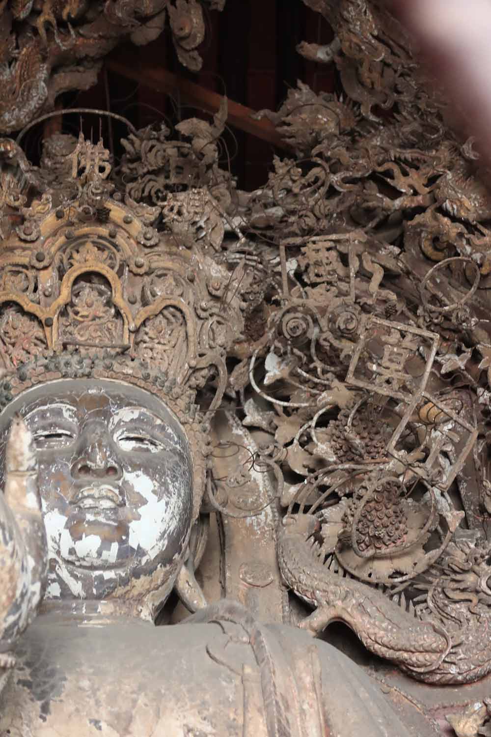 本次最让我感动的是大雄宝殿内的五尊佛。大雄宝殿是一座佛寺的主要大殿,双林寺的大雄宝殿供奉的是释伽牟尼三法身佛和两尊菩萨(文殊菩萨和普贤菩萨)还有一尊燃灯古佛。释伽牟尼三法身分别是:释迦牟尼佛、卢舍那佛、毗卢遮那佛。在五尊佛的正前方一座站立佛,为燃灯古佛。
