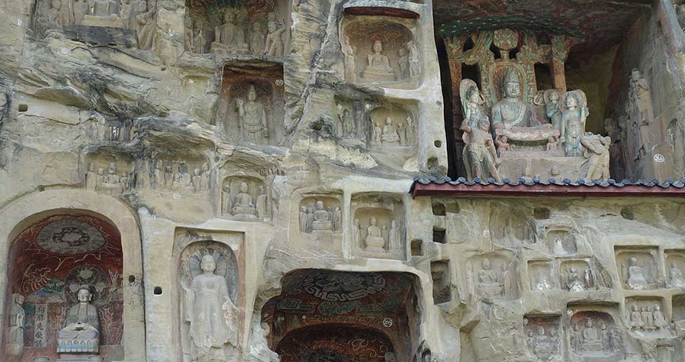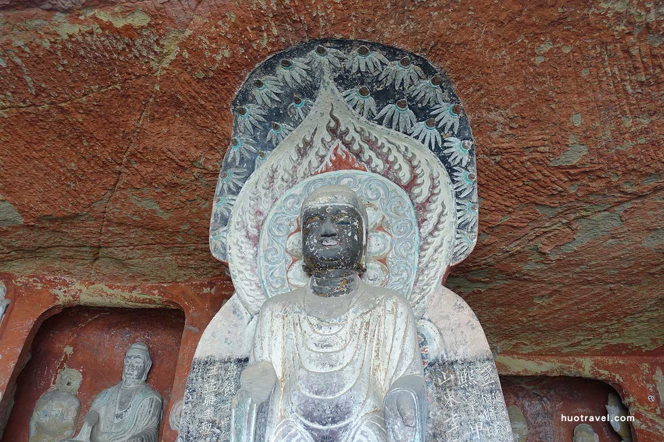 全崖造像以大云洞为中心,大云洞居于千佛崖中心位置,规模最大,共计造像234 尊,左右两壁雕有148 尊莲花观音像,窟正中一大佛立像为弥勒佛。 据说该尊弥勒佛是武则天的化身像。