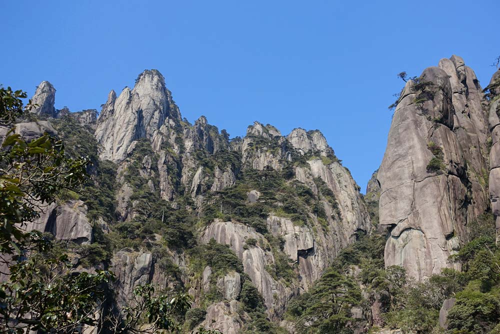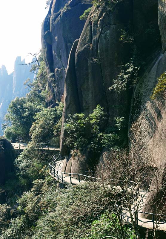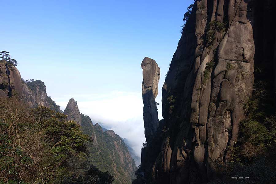 登山道半山腰,视野也豁然开朗,映入眼前的是高达1000多米的柱形花岗岩,如同倒着的钟乳石,直冲云霄。仿佛一张画,蓝天配青山,雾气朦胧,好似仙境一般。