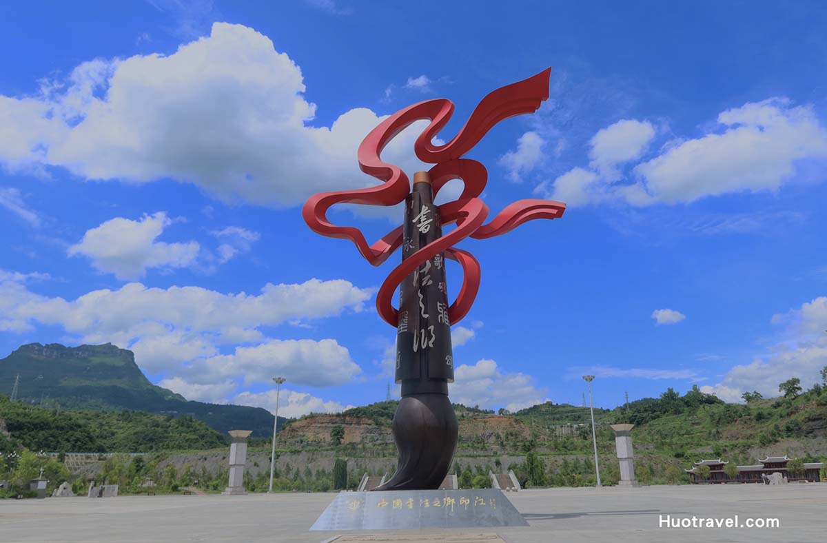 印江是书法之乡,“颐和园”匾额的题字就是印江县人严寅亮先生所题。在印江靠近西部,有一处书法广场,紧挨着印江县博物馆,远远的可以看到著名的大圣墩,一只大大的毛笔环绕着红色丝带,周边还有严寅亮先生的雕塑像。